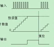 計(jì)數(shù)器的工作時(shí)序圖如圖二,當(dāng)產(chǎn)品數(shù)量計(jì)數(shù)到達(dá)預(yù)設(shè)值時(shí),計(jì)數(shù)器數(shù)字量輸出信號(hào)動(dòng)作,中止主機(jī)運(yùn)行。等用戶將計(jì)數(shù)器復(fù)位以后,主機(jī)又可以再次運(yùn)行。