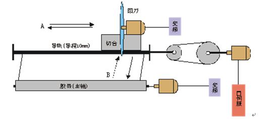 主軸電機用VFD-015M23A驅(qū)動,切臺上的圓刀(切刀)用VFD-007M23A驅(qū)動,伺服與齒輪同軸相連,通過齒輪皮帶帶動導軌,使切臺在如圖中A所示方向來回移動,用來完成定長的操作。同時切臺通過油壓可以在如圖中B所示方向前后移動,用來對套在主軸上的膠帶進行切割。