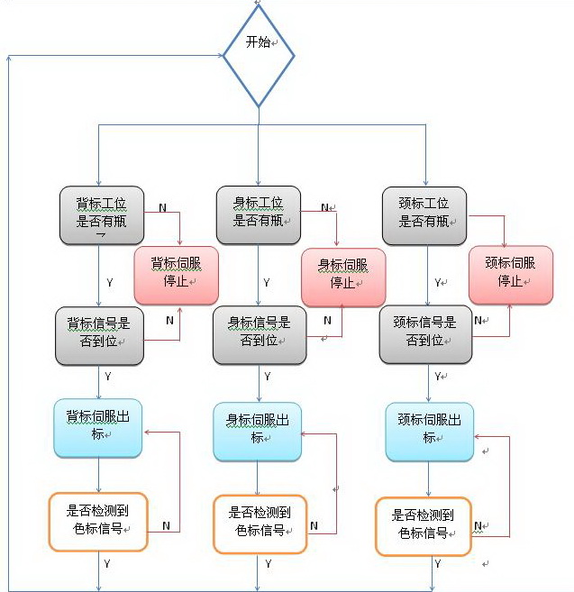 啤酒貼標(biāo)機(jī)由進(jìn)瓶傳送帶、主軸、出瓶傳送帶、貼標(biāo)伺服及各個(gè)位置傳感器組成。當(dāng)設(shè)備運(yùn)行時(shí),系統(tǒng)會(huì)檢測(cè)當(dāng)前貼標(biāo)工位是否有瓶子,如有,則對(duì)應(yīng)得貼標(biāo)伺服開始動(dòng)作。例如當(dāng)系統(tǒng)檢測(cè)到背標(biāo)工位上有瓶子,且貼標(biāo)有貼標(biāo)信號(hào)時(shí),則貼標(biāo)伺服開始動(dòng)作,由色標(biāo)檢測(cè)傳感器來結(jié)束貼標(biāo)動(dòng)作,身標(biāo)與頸標(biāo)動(dòng)作與背標(biāo)一致。