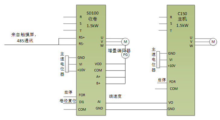 采用海利普提供的“觸摸屏+變頻器+電機收卷”的模式后,人機交換界面提高了設(shè)備的用戶友好性,也提升了設(shè)備的檔次。通過觸摸屏可以輕松實現(xiàn)人與機器的互動,讓操作變得簡單、直觀和可靠。