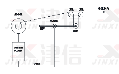 如圖中所示;設備主要包含導輪支架,0-10V電位器,收卷電機,丹佛斯FC360變頻器。FC360根據擺桿位置反饋控制放卷電機的轉速快慢和方向正反,使得放線速度和牽引速度保持同步,并使得擺桿在某個位置穩定,放線速度穩定恒速。