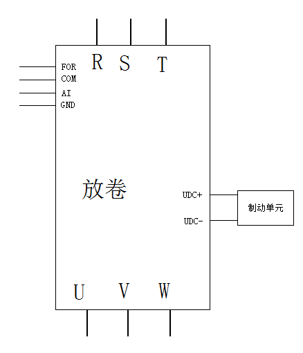 - 放卷變頻器采用開(kāi)環(huán)轉(zhuǎn)矩控制,電機(jī)處于發(fā)電狀態(tài),必需接制動(dòng)單元,并且與收卷變頻器共直流母線;