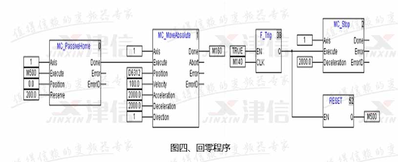 在執行回零的過程中,如發生故障或按下急停,則調用“MC_Stop”指令來使當前軸停止回零動作。程序如圖四所示: